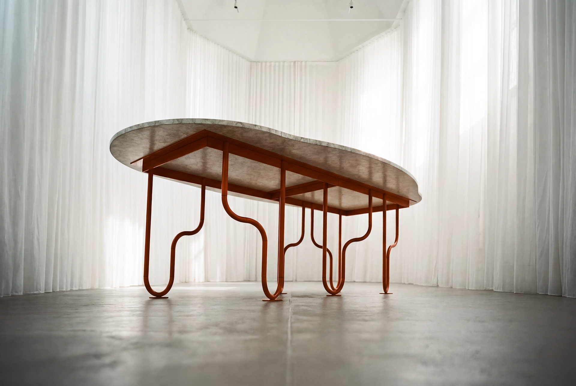 Recibimos este objeto como quien recibe una pausa. El reverso de la mesa corresponde a la dimensión espacial de sus patas, donde el quiebre de los planos genera un espesor que no pesa, sino que arma el lugar. Exponer la pieza es hacer presente el plano que da continuidad a la reunión, para que el diseño conforme un corpus; es decir, el soporte sostenido de un encuentro que ahora adquiere volumen.