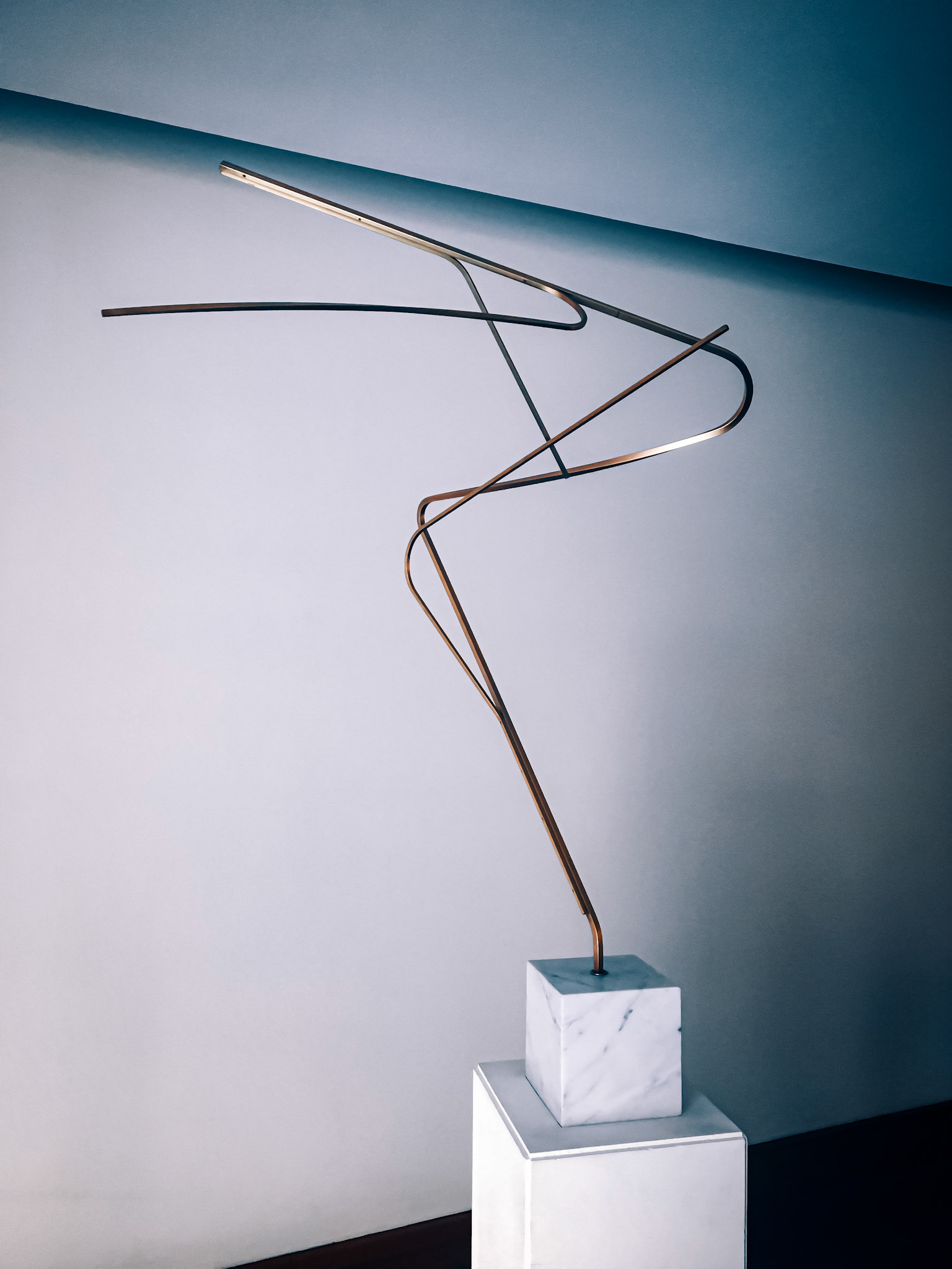 Existen objetos que no buscan habitar el espacio, sino más bien interrogarlo. Esta pieza, compuesta por una delicada línea de latón que emerge de la severidad de un cubo de mármol, se presenta como un ejercicio de precisión absoluta. Aquí, el diseño se desprende de todo peso innecesario para explorar el límite de lo que permanece.