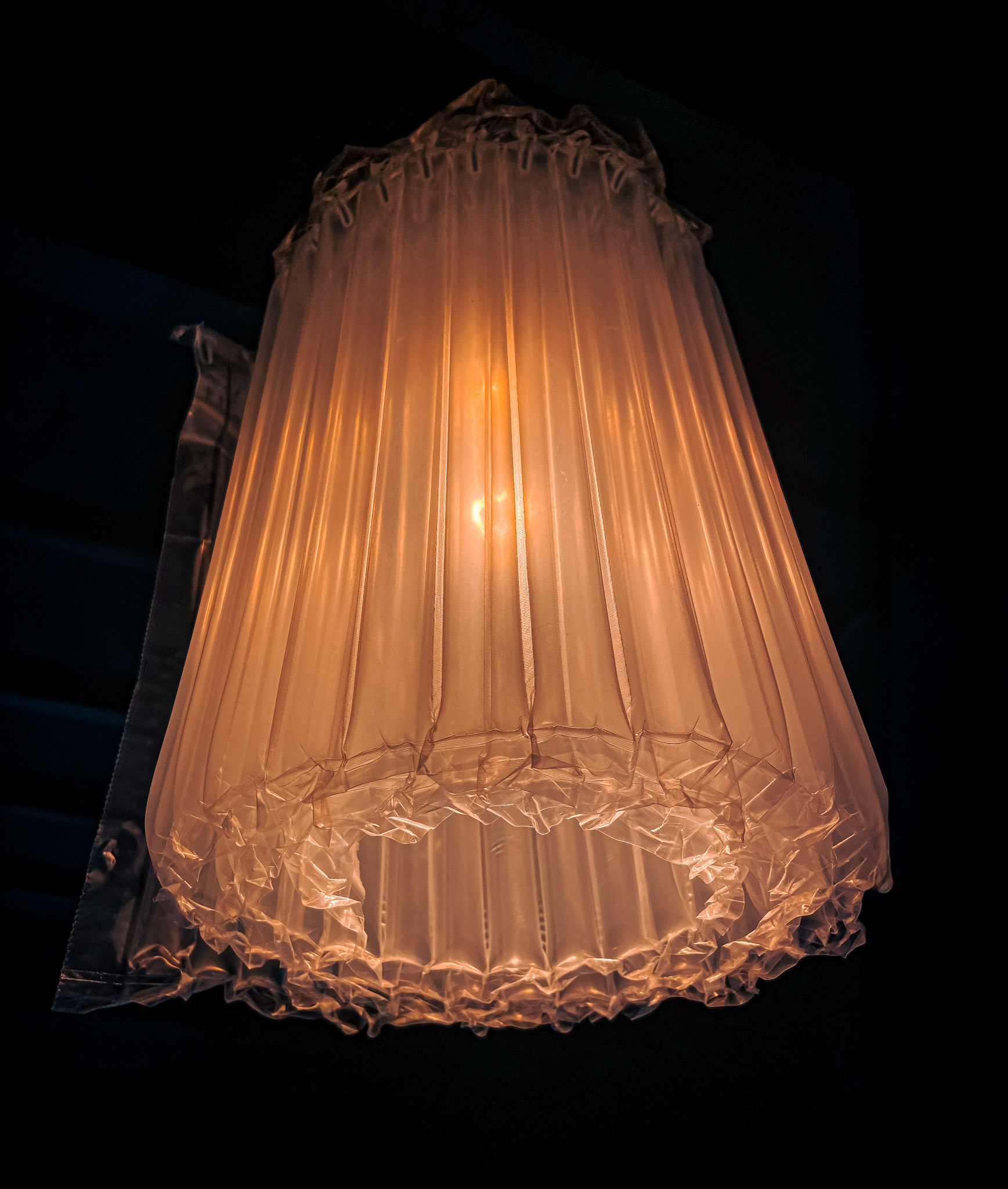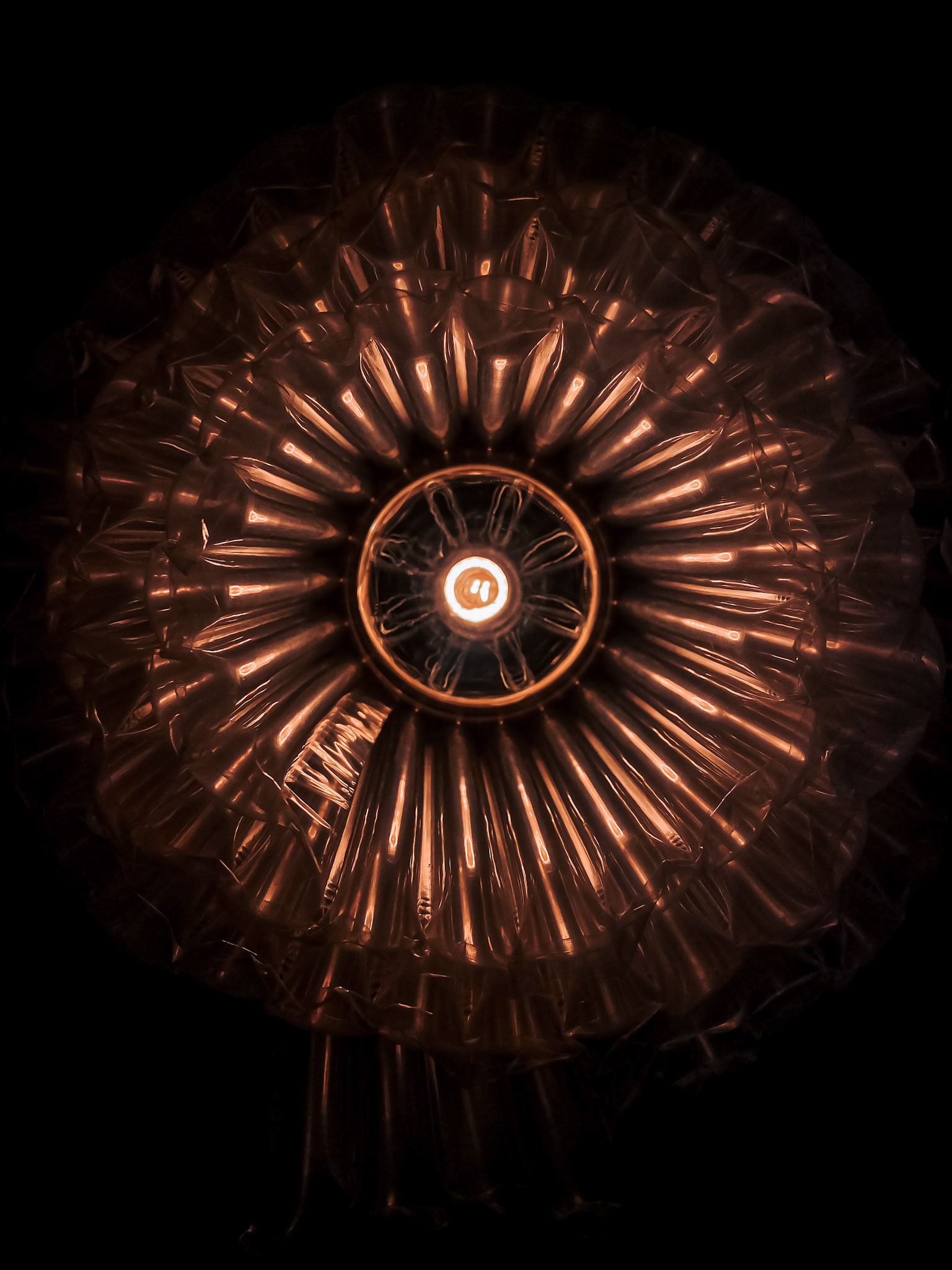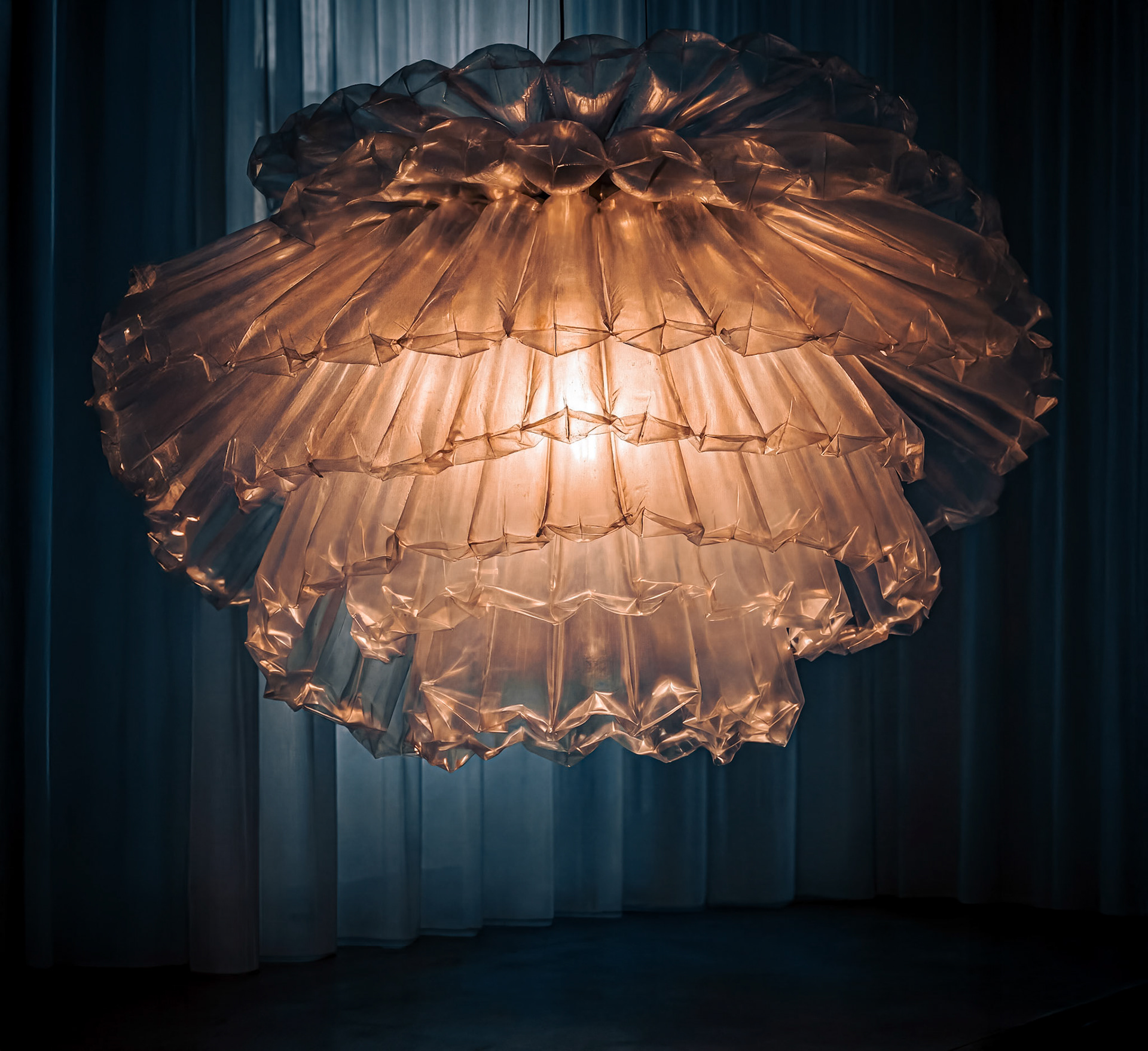 Mientras que su vista inferior revela un orden radial casi hipnótico, su presencia cilíndrica se manifiesta como una columna atmosférica diseñada para captar el fenómeno de la gradualidad lumínica. En esta estructura orgánica, lo que antes era desecho se vuelve refugio, permitiendo que la claridad no se entregue de inmediato, sino que se dilate en el tiempo y el espacio a través de sus capas de aire.
