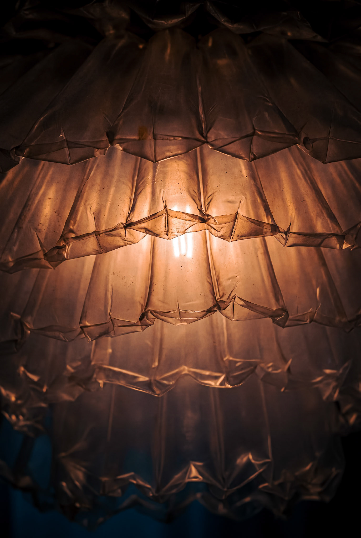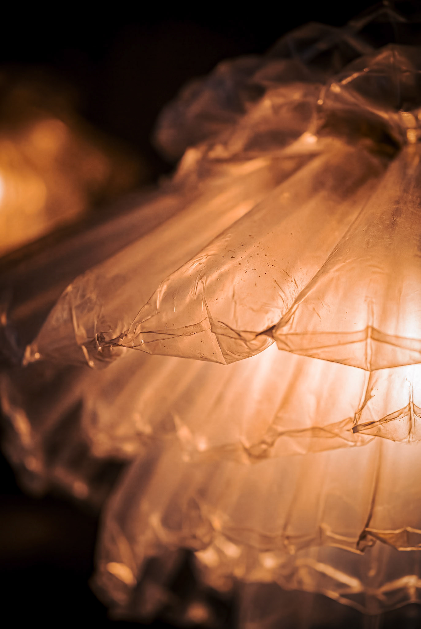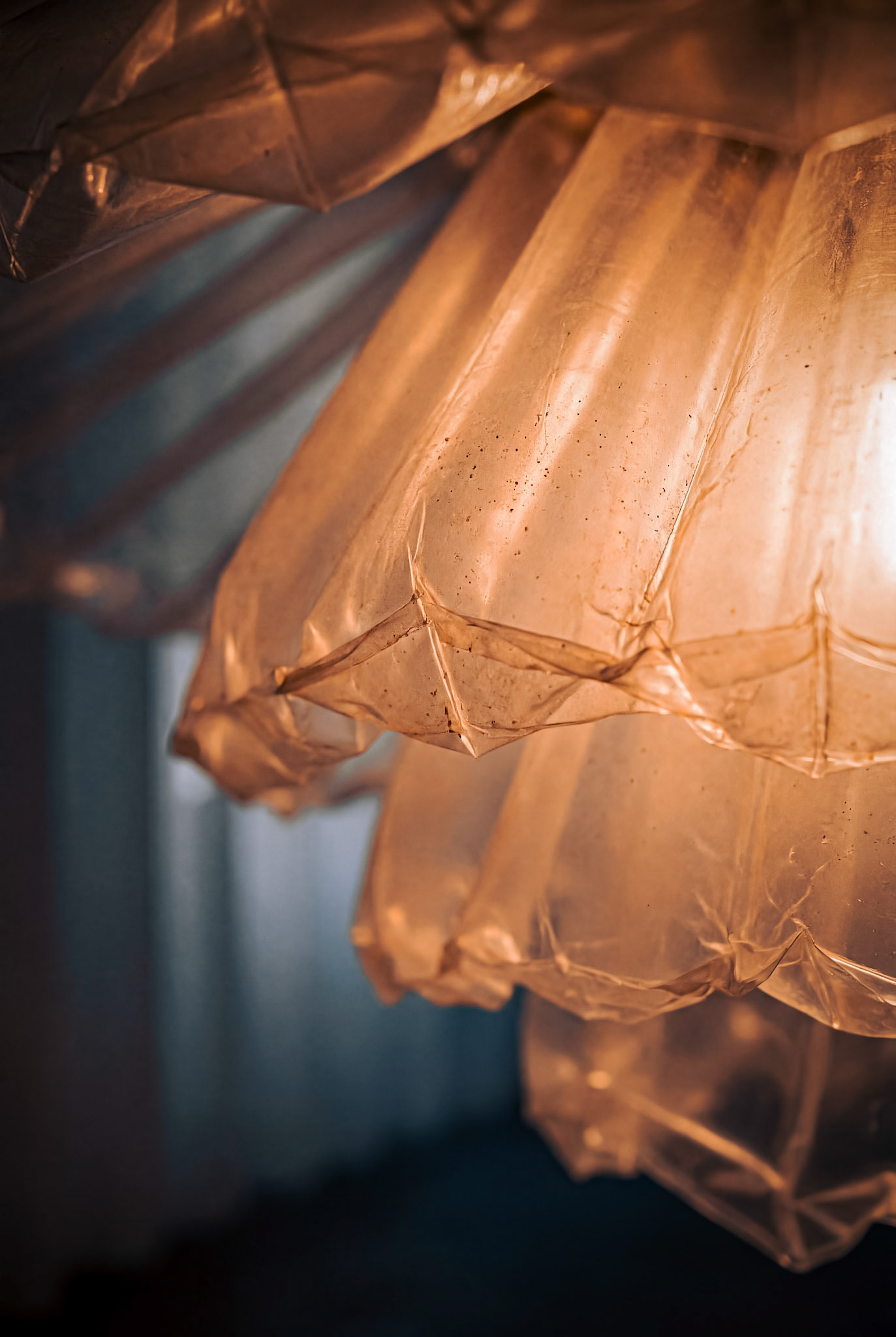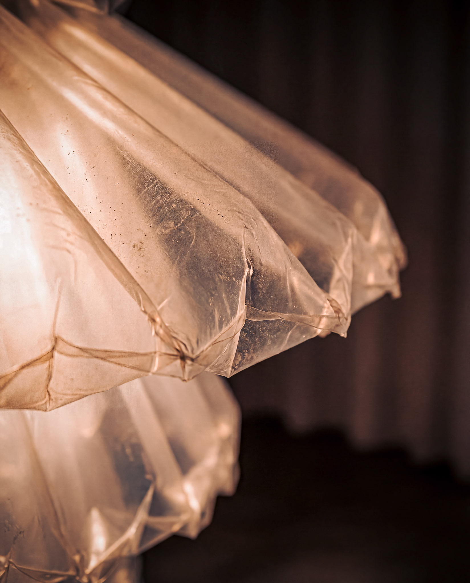 Mientras que su vista inferior revela un orden radial casi hipnótico, su presencia cilíndrica se manifiesta como una columna atmosférica diseñada para captar el fenómeno de la gradualidad lumínica. En esta estructura orgánica, lo que antes era desecho se vuelve refugio, permitiendo que la claridad no se entregue de inmediato, sino que se dilate en el tiempo y el espacio a través de sus capas de aire.