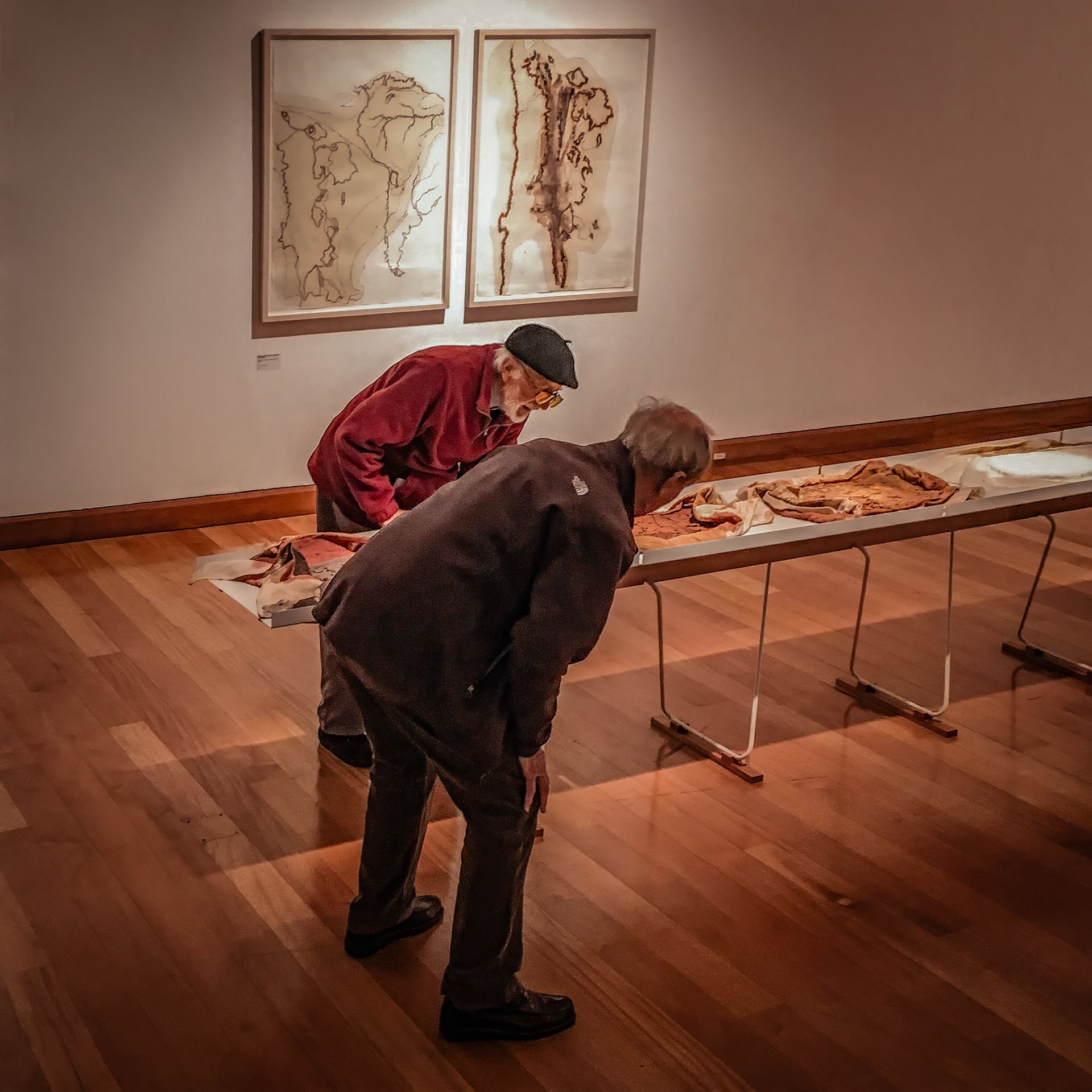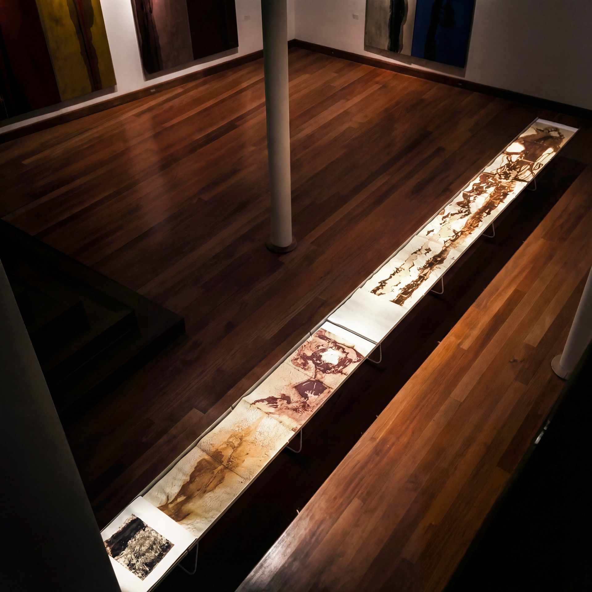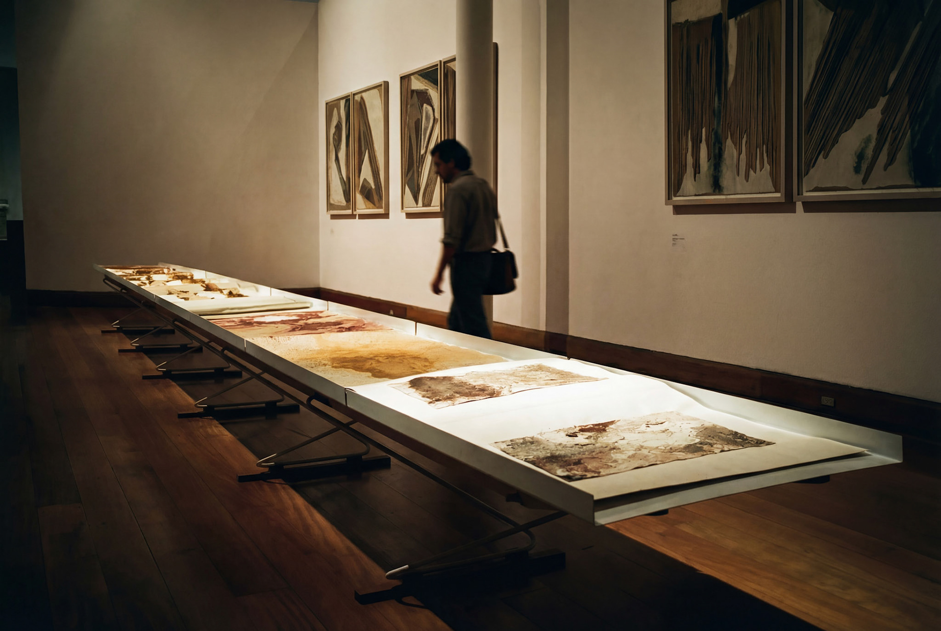 El trabajo de Hernán, su pulso nómada y la detención ante el vacío, torna cada rastro en un elogio a la inmensidad; dejando entrever cómo el sedimento, el trazo y la geografía del silencio se toman de la mano. Capas y capas de materia, tierras de origen y pigmentos se han ido estratificando y aglomerando hasta volverse un lenguaje de impronta continental, una reconstrucción del Altiplano en el interior del museo.