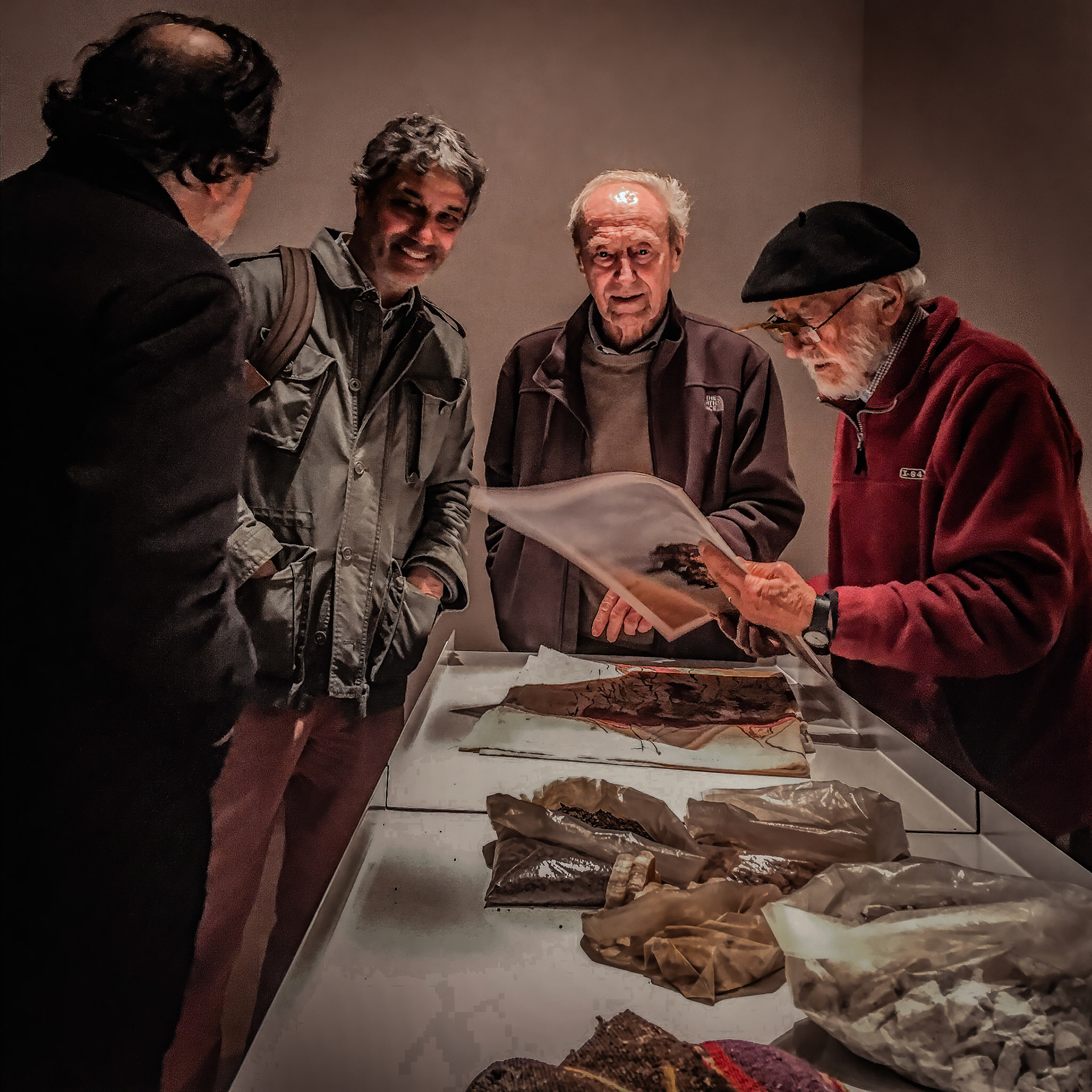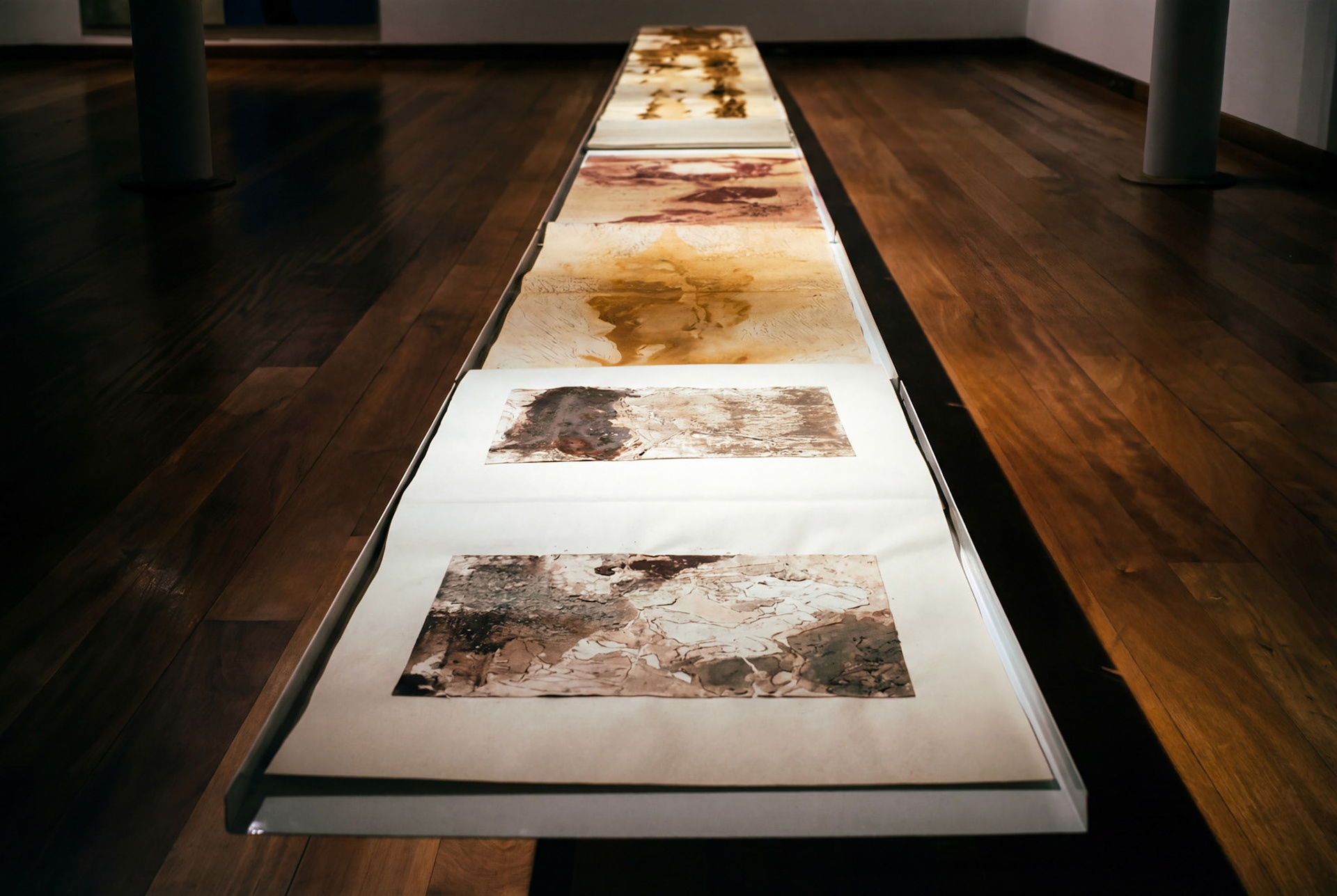 Recibimos sus vestigios, que es recibir también a las distancias que los motivaron, más no su lejanía; ese campo queda abierto, y por tanto, posible de ser habitado. El montaje de esta muestra corresponde a la dimensión en común entre los salares de Uyuni, Coipasa, El Laco y Surire: la horizontalidad absoluta. Exponer el recorrido en una mesa-horizonte es buscar hacer presente el paso del tiempo y la huella, para que la muestra conforme un corpus; es decir, la bitácora física de una pasión sostenida.