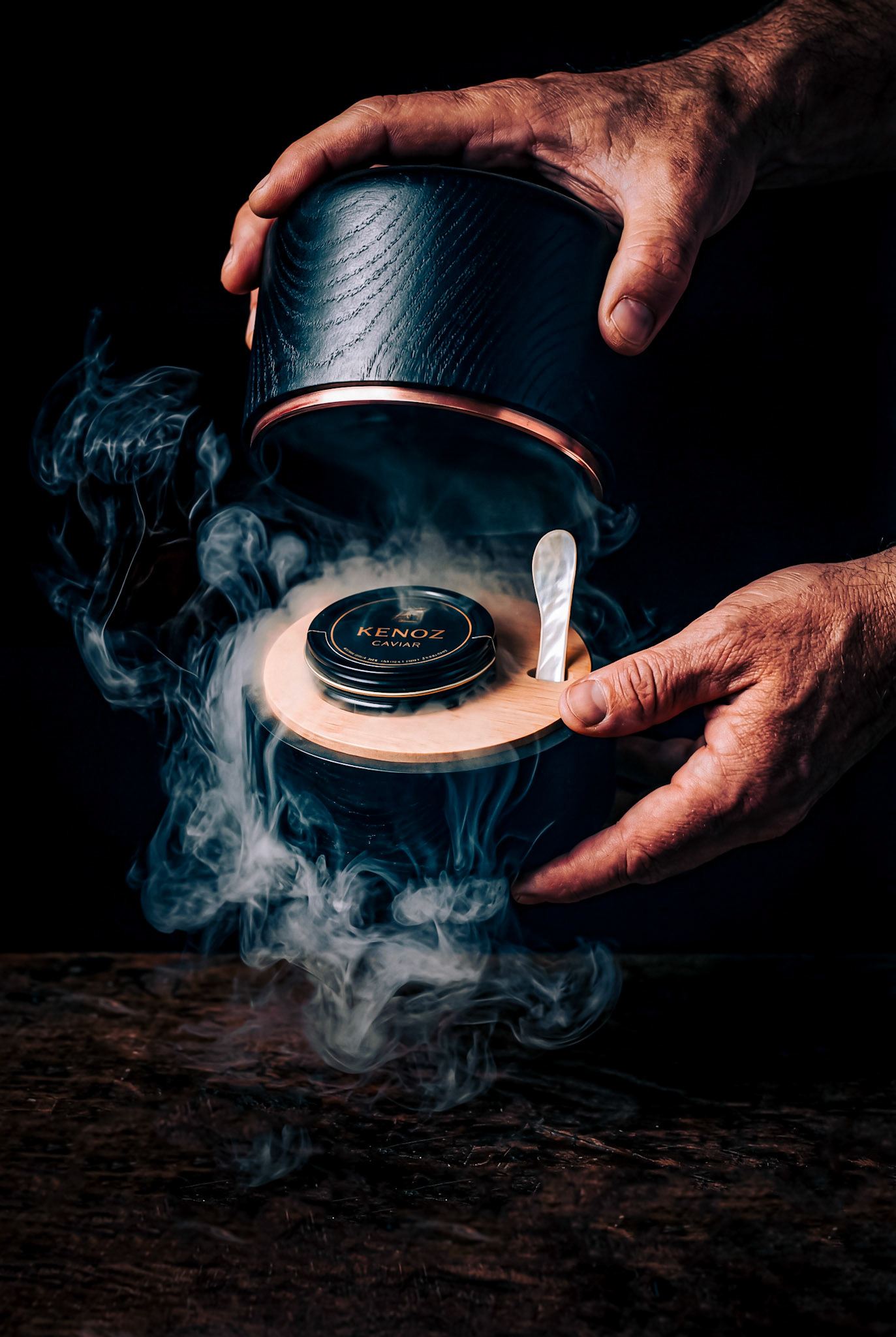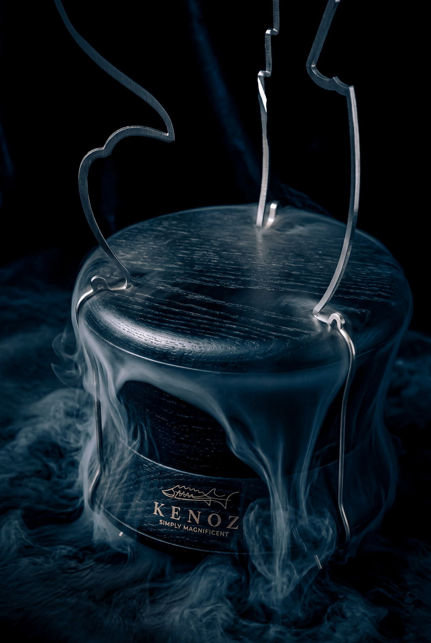 "Anatomía de un Origen" representa una innovadora convergencia entre la alta ebanistería y la ingeniería de diseño para KENOZ, transformando un empaque de lujo en un dispositivo ritual de conservación criogénica. El objeto presenta una dualidad material con un exterior de madera negra de acabado satinado y veta visible que resguarda un núcleo luminoso de cobre pulido, manteniendo la tapa asegurada mediante tres cierres de acero inoxidable cuya forma es el resultado de la deconstrucción orgánica del esturión del logotipo de la marca. Esta pieza funcional integra un receptáculo oculto de nitrógeno sólido que preserva el caviar en su rango óptimo de temperatura —entre -2°C y 2°C— mientras genera una neblina gélida al momento de la apertura, elevando la presentación de la lata y la cuchara de nácar a una experiencia sensorial y teatral de vanguardia.